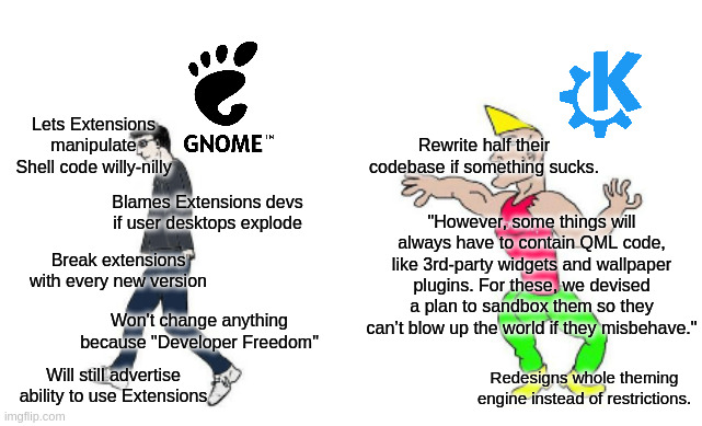 Natanox@discuss.tchncs.de to linuxmemes@lemmy.worldEnglish · 8 months agoWho needs stable, feature-rich desktops anywayimagemessage-square233linkfedilinkarrow-up1772arrow-down135file-text
