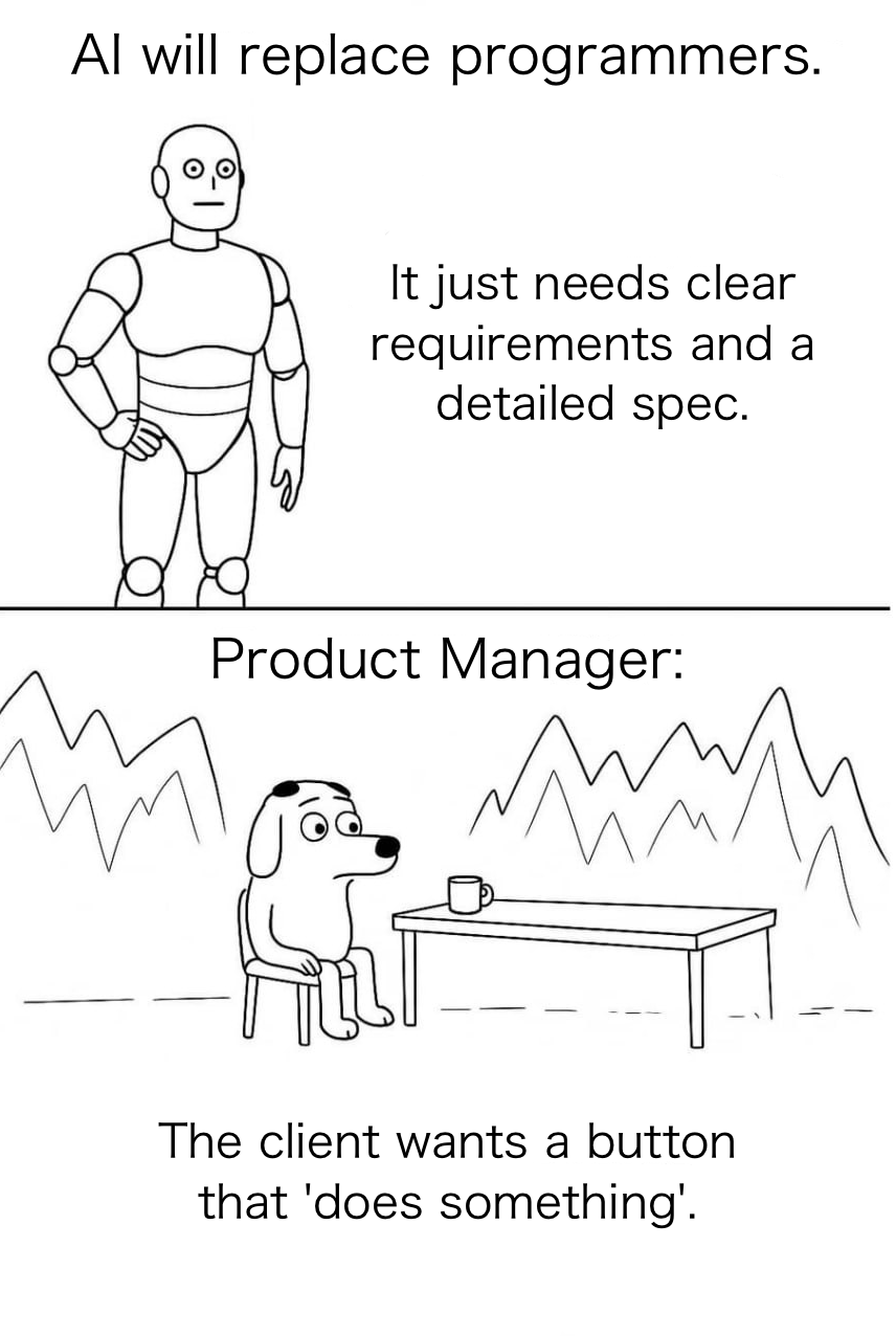 arrow-up11.22Karrow-down1imageAI will replace programmerscm0002@lemmy.world to Programmer Humor@programming.dev · 8 months agomessage-square131linkfedilinkcross-posted to: programmerhumor@lemmy.ml
