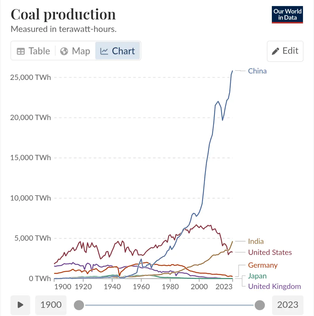 Yes, those countries are also building clean sources of power, but coal is about 55% of their primary energy each. 80% of Chinas primary energy comes from fossil fuels and 90% of India’s. Their rate of new coal outstrips their use of wind and solar.