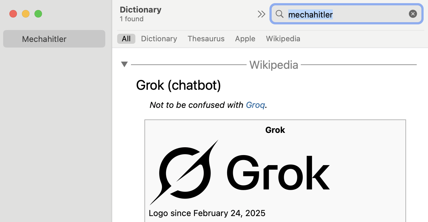 LOL the macos dictionary entry/quicklook entry for “MechaHitler” gives you Grok’s wikipedia page
