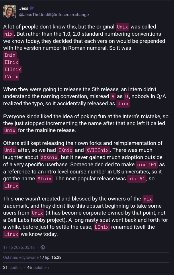 Huh, I always thought Linux stood for “Linus eXtreme”. The more you know…
