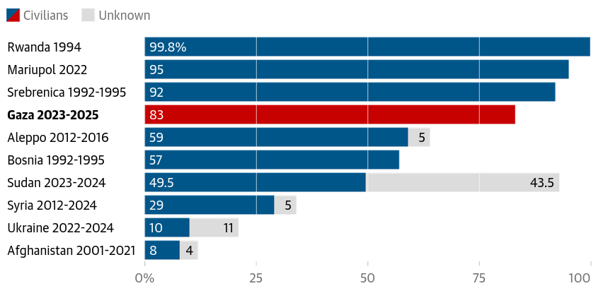 Note that this means “83% of people killed were civilians”, not that 83% of civilians were killed. As the graph in the article illustrates, that puts this neck and neck with other recent genocides: