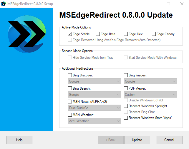 As shown in the image, the additional redirections include Bing Discover, Bing Search, MSN News, MSN Weather, Bing Images, PDF Viewer. Additionally, you can disable CoPilot, redirect Spotlight, Bing Chat, and Windows Store Apps.