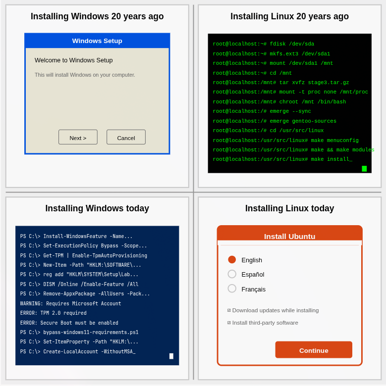 Panel 1: “Installing Windows 20 years ago” screenshot of install wizard with just a couple buttons